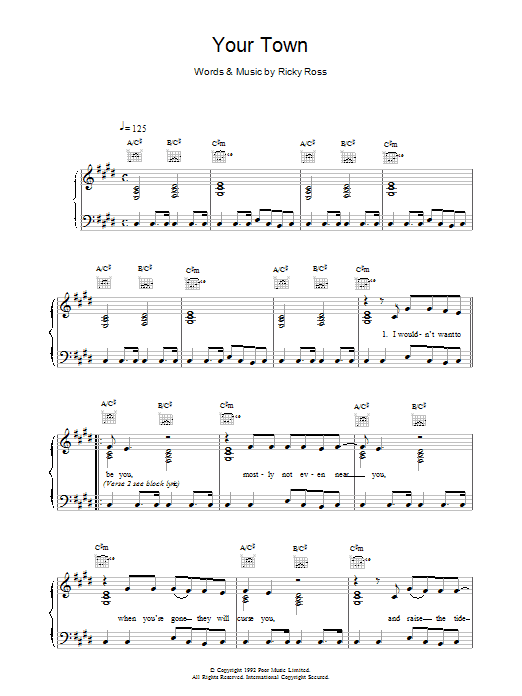 Download or print Deacon Blue Your Town sheet music, chords and digital score arranged for Piano, Vocal & Guitar Chords. This Pop score includes 3 page(s).