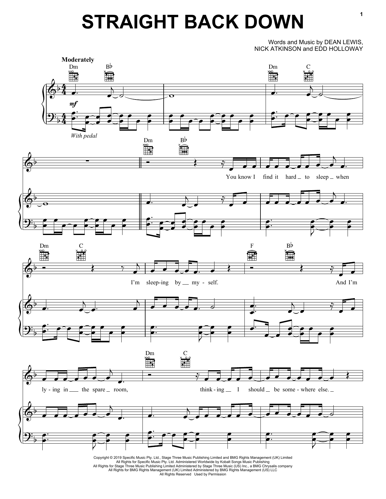 Download or print Dean Lewis Straight Back Down sheet music, chords and digital score arranged for Piano, Vocal & Guitar Chords (Right-Hand Melody). This Pop score includes 7 page(s).