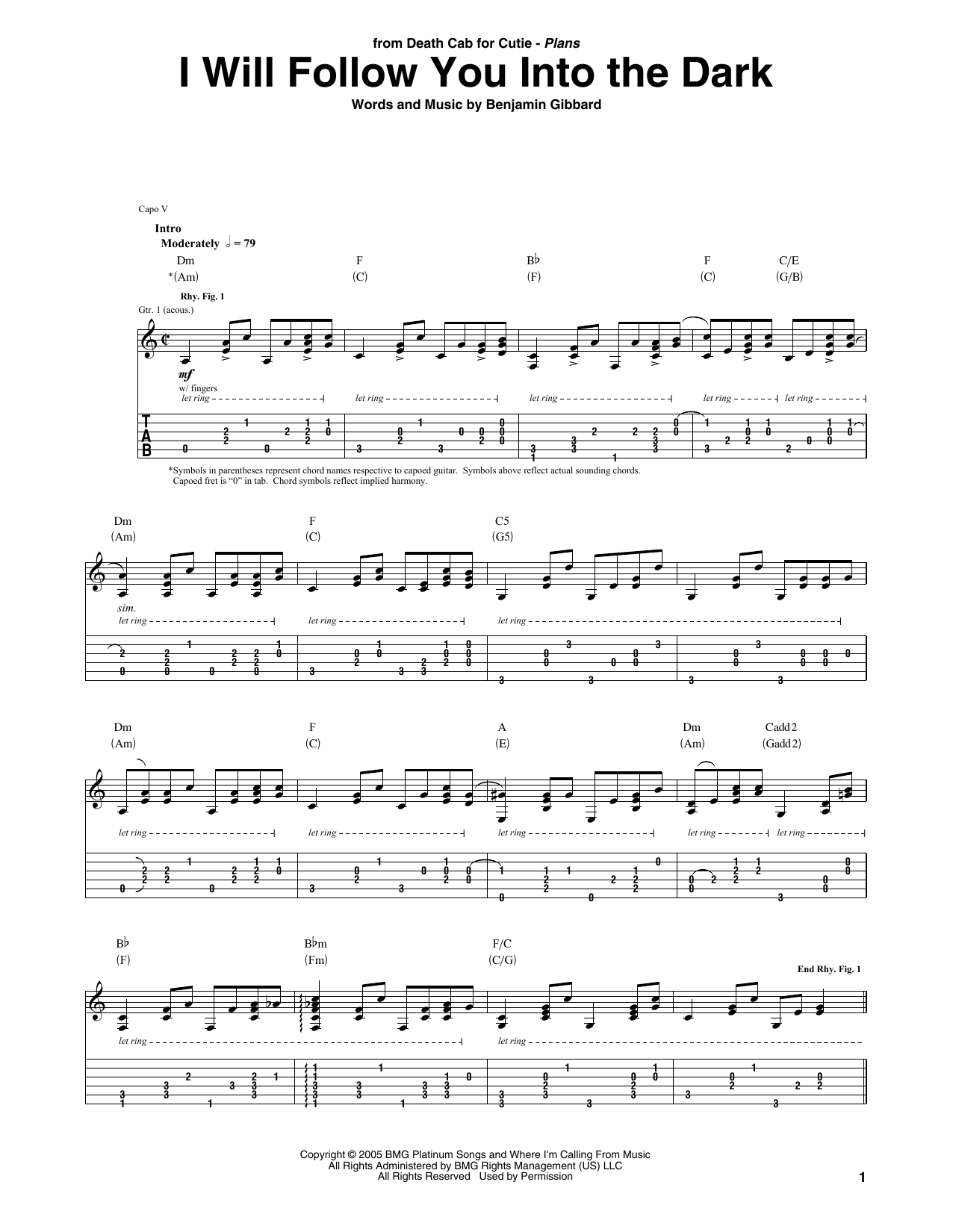 Download or print Death Cab For Cutie I Will Follow You Into The Dark sheet music, chords and digital score arranged for Piano, Vocal & Guitar Chords (Right-Hand Melody). This Folk score includes 7 page(s).