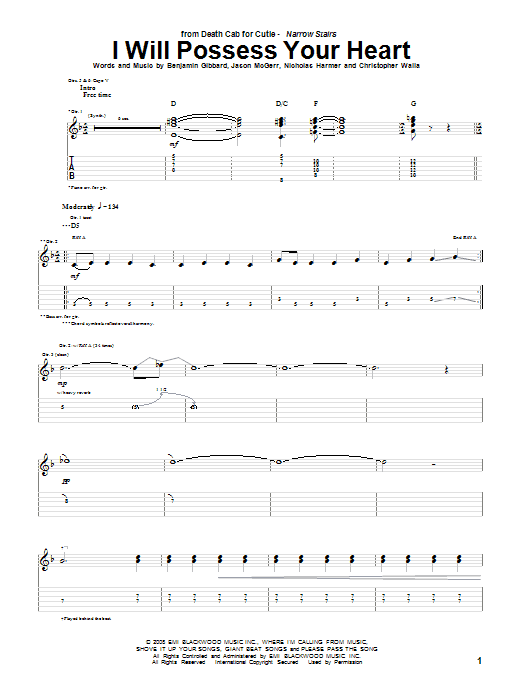 Download or print Death Cab For Cutie I Will Possess Your Heart sheet music, chords and digital score arranged for Guitar Tab. This Pop score includes 14 page(s).