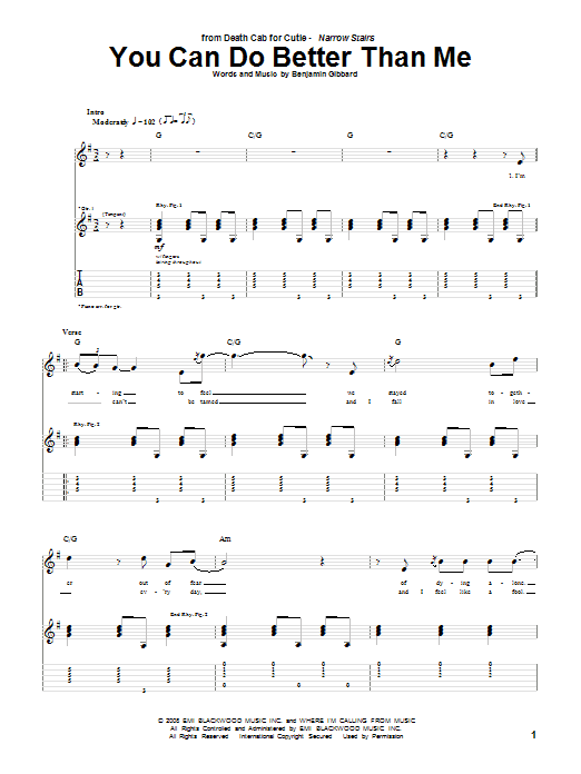 Download or print Death Cab For Cutie You Can Do Better Than Me sheet music, chords and digital score arranged for Guitar Tab. This Pop score includes 3 page(s).