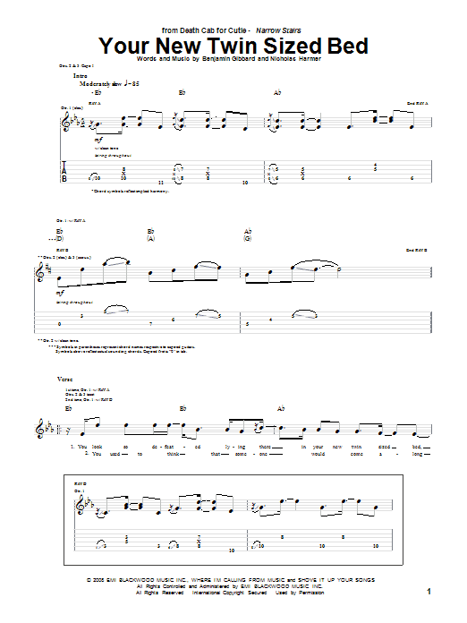 Download or print Death Cab For Cutie Your New Twin Sized Bed sheet music, chords and digital score arranged for Guitar Tab. This Pop score includes 6 page(s).