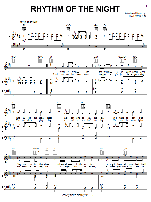 Download or print DeBarge Rhythm Of The Night sheet music, chords and digital score arranged for Lead Sheet / Fake Book. This Pop score includes 2 page(s).