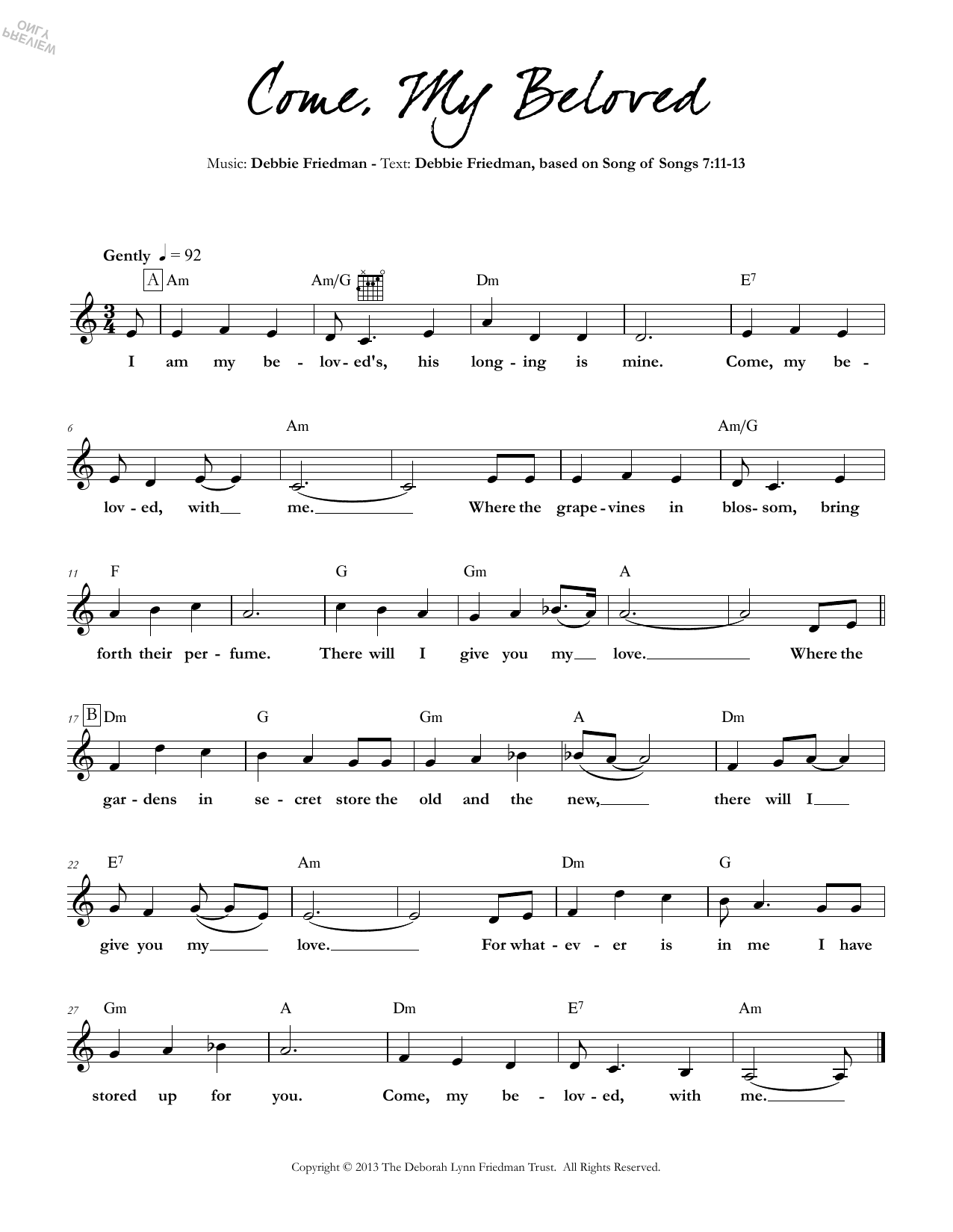 Download or print Debbie Friedman Come, My Beloved sheet music, chords and digital score arranged for Lead Sheet / Fake Book. This Jewish score includes 1 page(s).