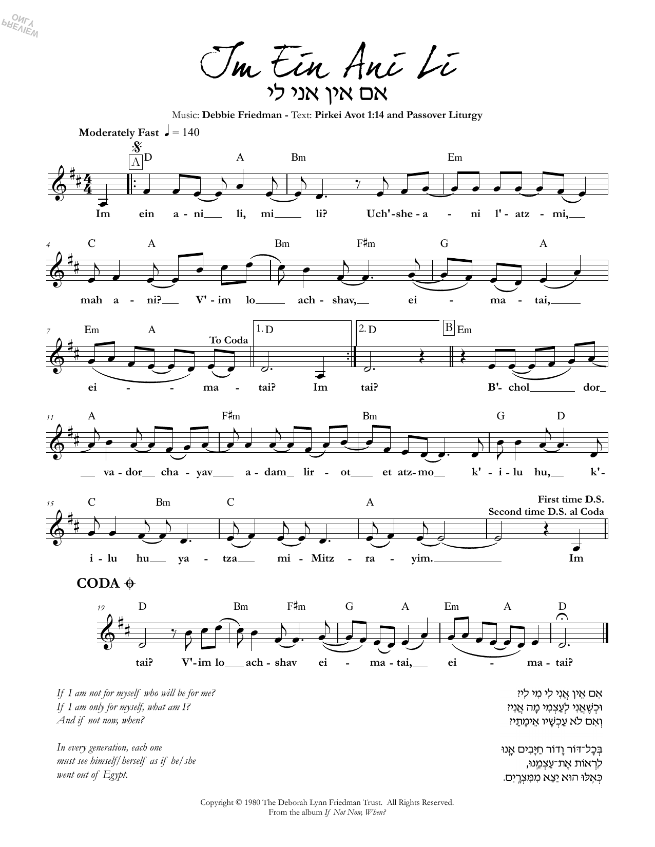 Download or print Debbie Friedman Im Ein Ani Li sheet music, chords and digital score arranged for Lead Sheet / Fake Book. This Jewish score includes 1 page(s).