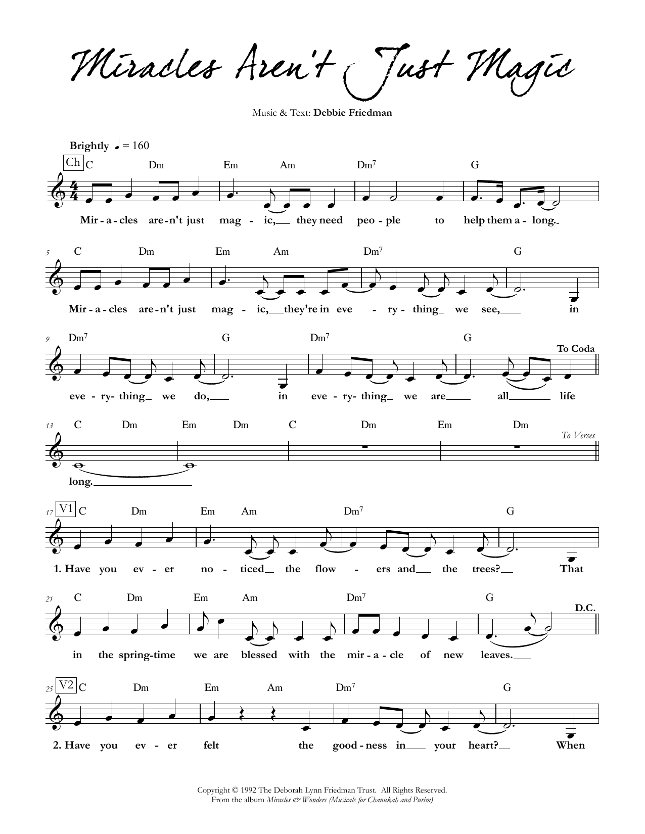 Download or print Debbie Friedman Miracles Aren't Just Magic sheet music, chords and digital score arranged for Lead Sheet / Fake Book. This Jewish score includes 2 page(s).
