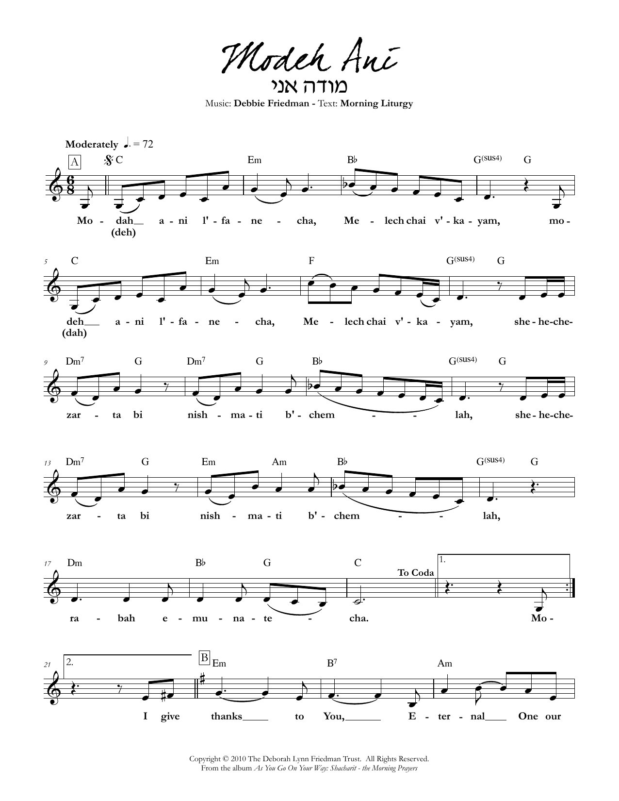 Download or print Debbie Friedman Modeh Ani sheet music, chords and digital score arranged for Lead Sheet / Fake Book. This Jewish score includes 2 page(s).