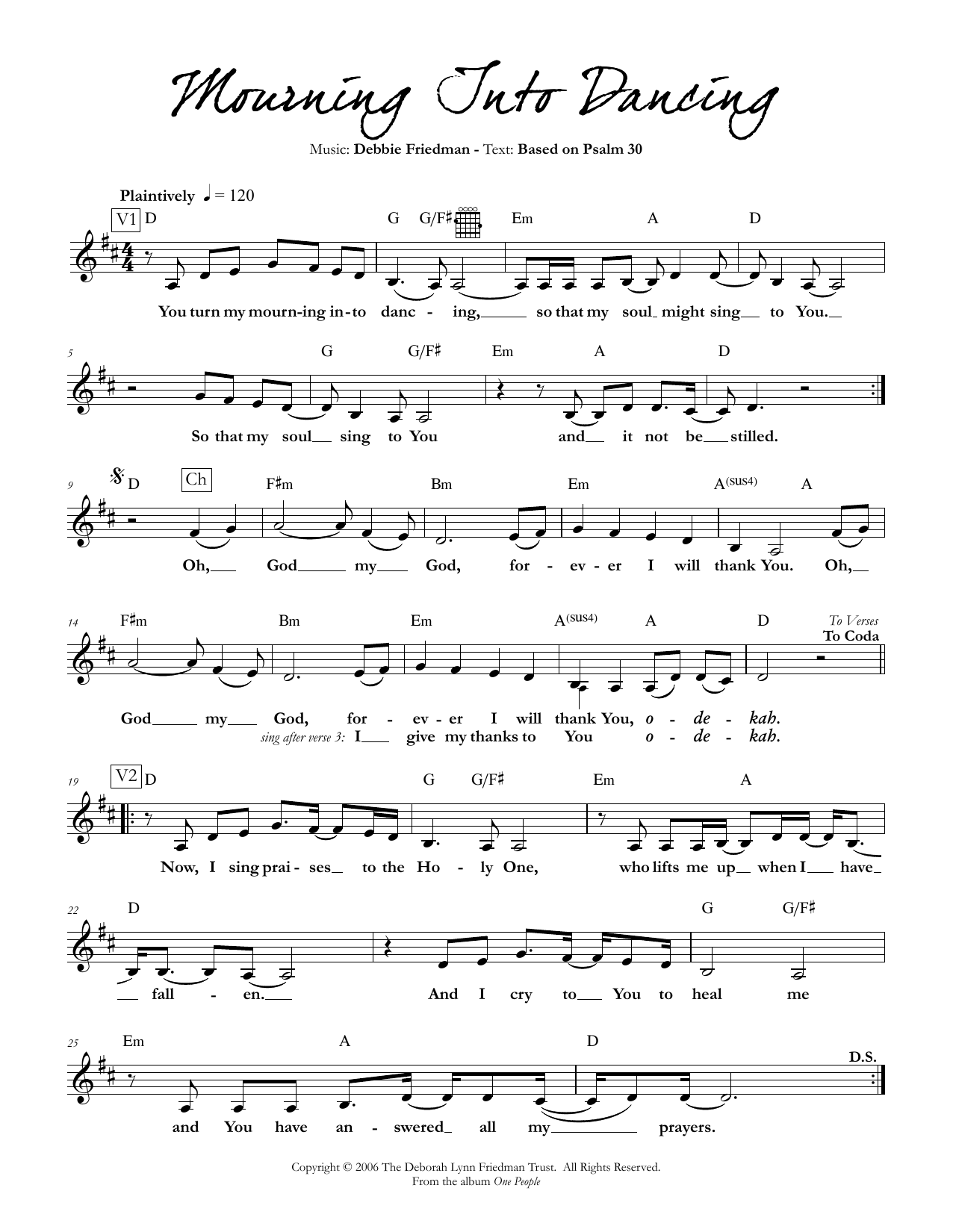 Download or print Debbie Friedman Mourning Into Dancing sheet music, chords and digital score arranged for Lead Sheet / Fake Book. This Jewish score includes 2 page(s).