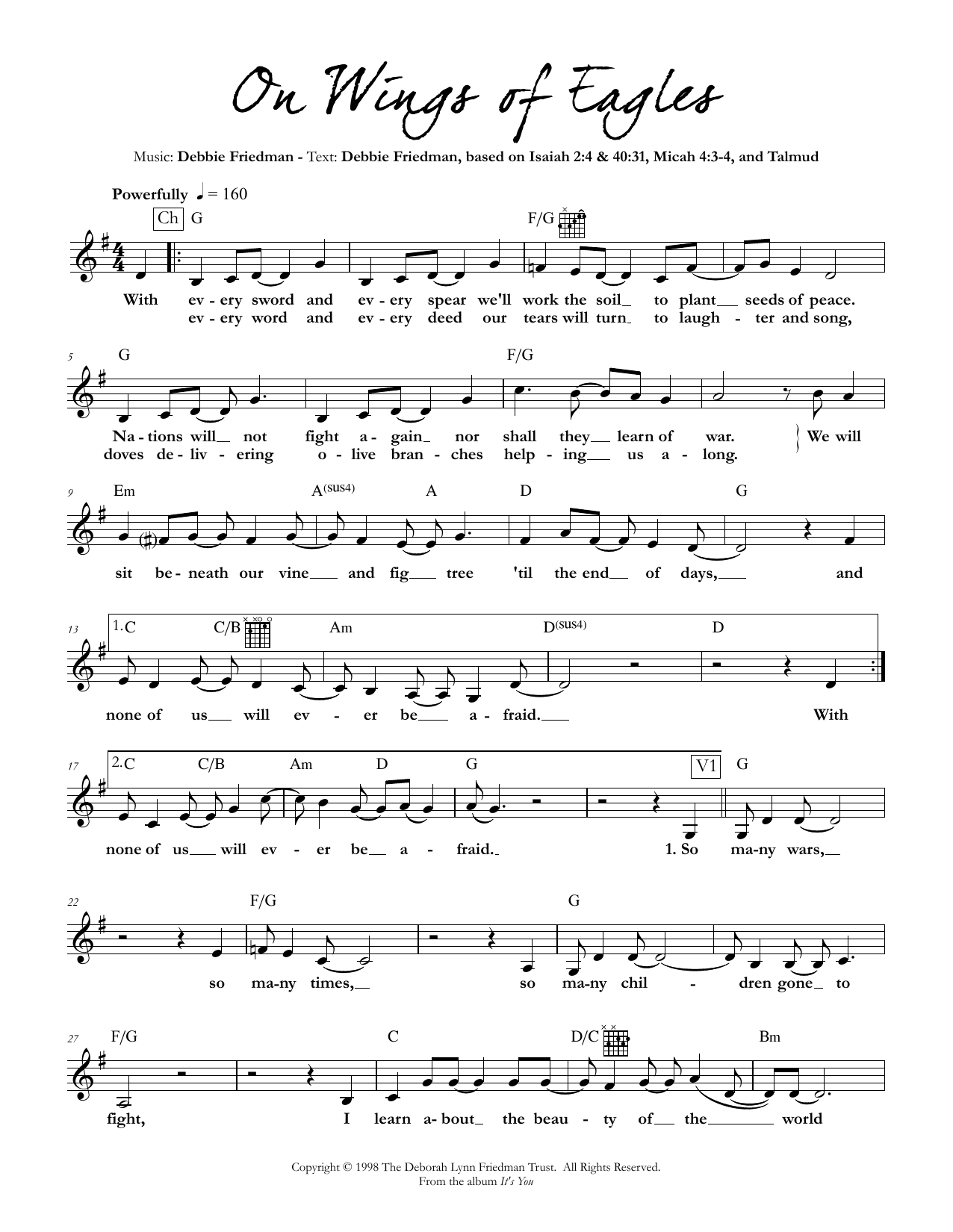Download or print Debbie Friedman On Wings of Eagles sheet music, chords and digital score arranged for Lead Sheet / Fake Book. This Jewish score includes 5 page(s).