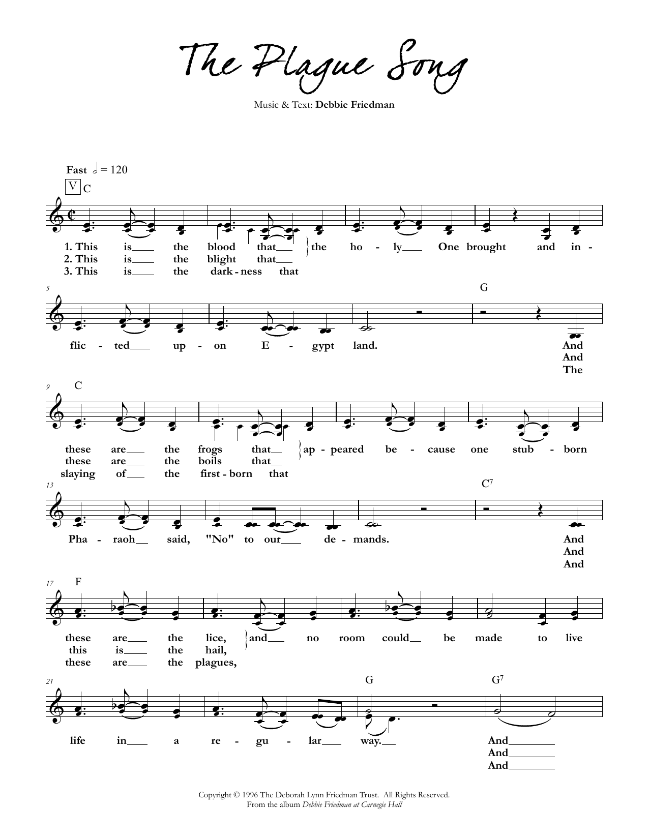 Download or print Debbie Friedman The Plague Song sheet music, chords and digital score arranged for Lead Sheet / Fake Book. This Jewish score includes 2 page(s).