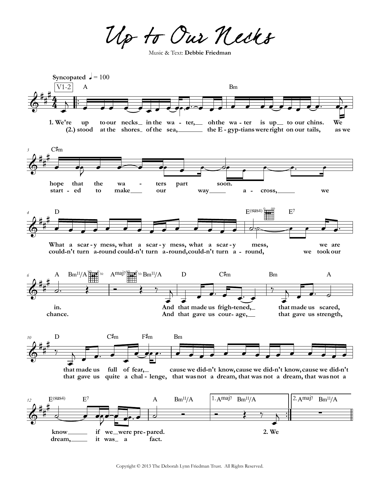 Download or print Debbie Friedman Up To Our Necks sheet music, chords and digital score arranged for Lead Sheet / Fake Book. This Jewish score includes 2 page(s).