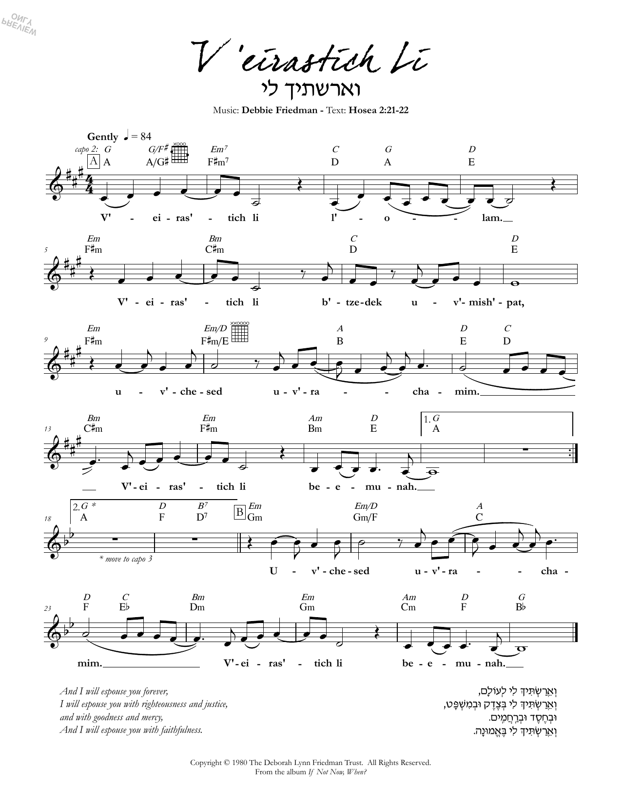 Download or print Debbie Friedman V'eirastich Li sheet music, chords and digital score arranged for Lead Sheet / Fake Book. This Jewish score includes 1 page(s).