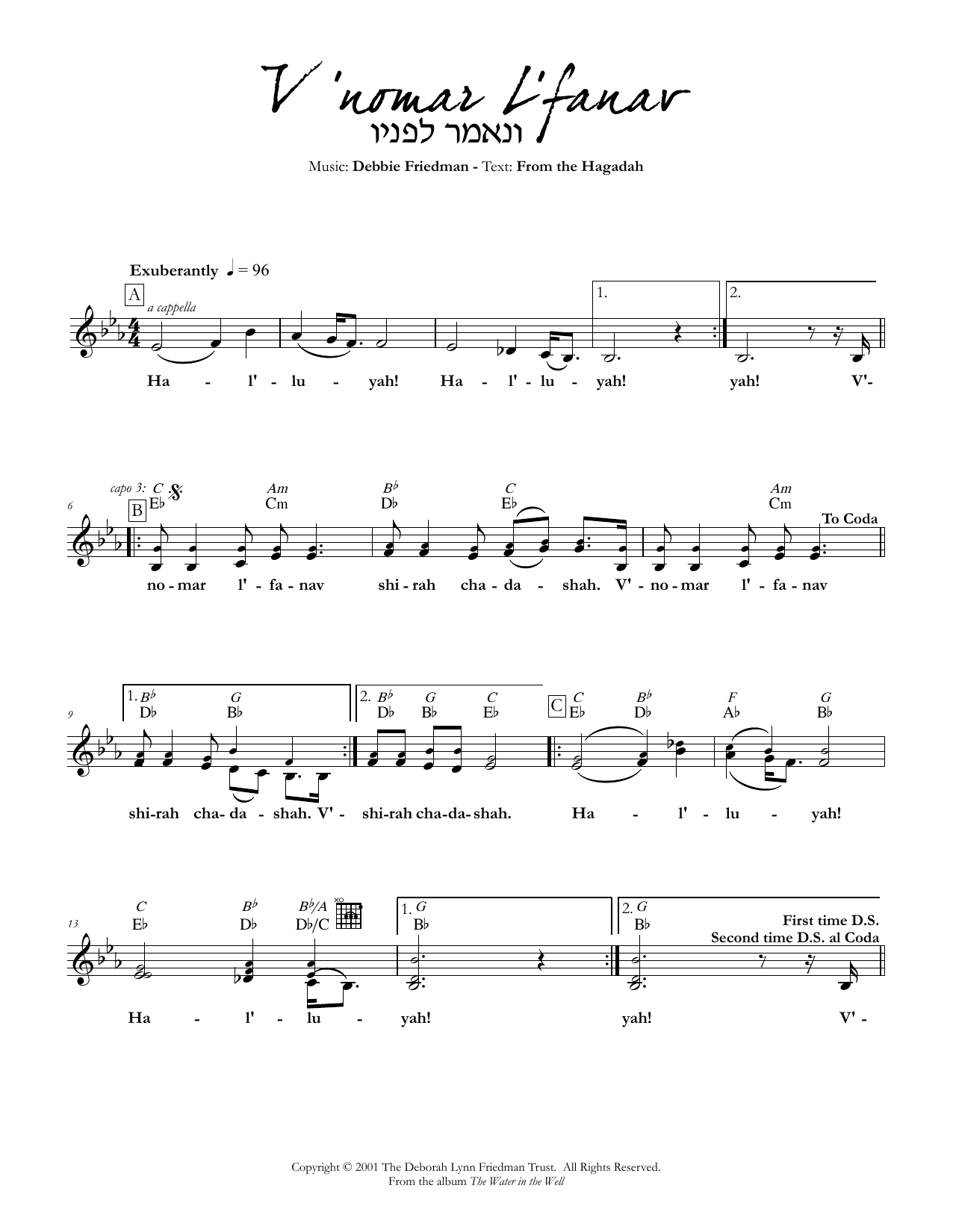 Download or print Debbie Friedman V'nomar L'fanav sheet music, chords and digital score arranged for Lead Sheet / Fake Book. This Jewish score includes 2 page(s).