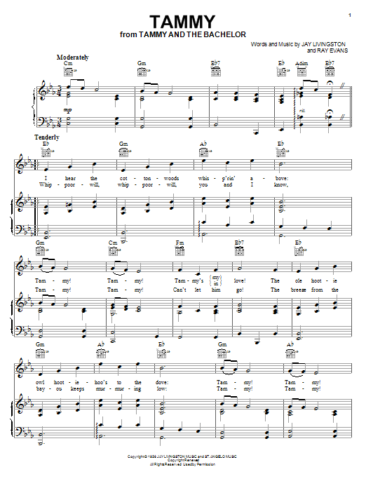 Download or print Debbie Reynolds Tammy sheet music, chords and digital score arranged for Piano, Vocal & Guitar Chords (Right-Hand Melody). This Film/TV score includes 2 page(s).