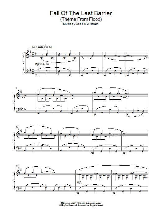 Download or print Debbie Wiseman Fall Of The Last Barrier (Theme From Flood) sheet music, chords and digital score arranged for Piano Solo. This Film/TV score includes 4 page(s).