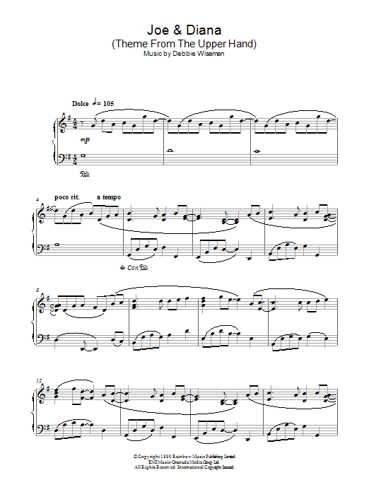 Download or print Debbie Wiseman Joe & Diana (Theme From The Upper Hand) sheet music, chords and digital score arranged for Piano Solo. This Film/TV score includes 4 page(s).