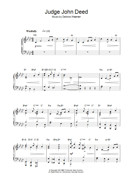 Download or print Debbie Wiseman Judge John Deed sheet music, chords and digital score arranged for Piano Solo. This Film/TV score includes 3 page(s).