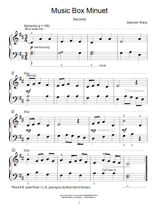 Download or print Deborah Brady Music Box Minuet sheet music, chords and digital score arranged for Piano Duet. This Children score includes 4 page(s).
