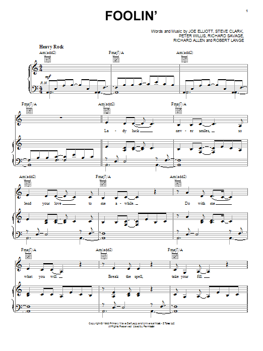 Download or print Def Leppard Foolin' sheet music, chords and digital score arranged for Easy Guitar Tab. This Metal score includes 4 page(s).