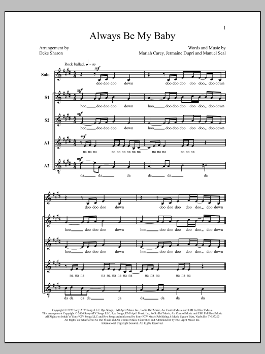 Download or print Deke Sharon Always Be My Baby sheet music, chords and digital score arranged for SSAA Choir. This A Cappella score includes 14 page(s).