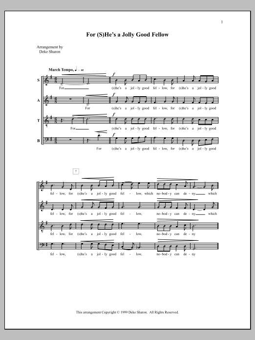 Download or print Deke Sharon For (S)He's a Jolly Good Fellow sheet music, chords and digital score arranged for SATB Choir. This A Cappella score includes 4 page(s).
