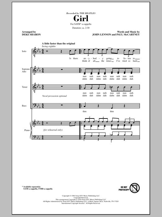 Download or print Deke Sharon Girl sheet music, chords and digital score arranged for TTBB Choir. This A Cappella score includes 11 page(s).