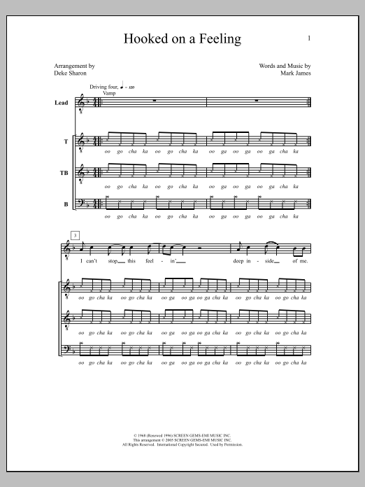 Download or print Deke Sharon Hooked On A Feeling sheet music, chords and digital score arranged for TTBB Choir. This A Cappella score includes 10 page(s).