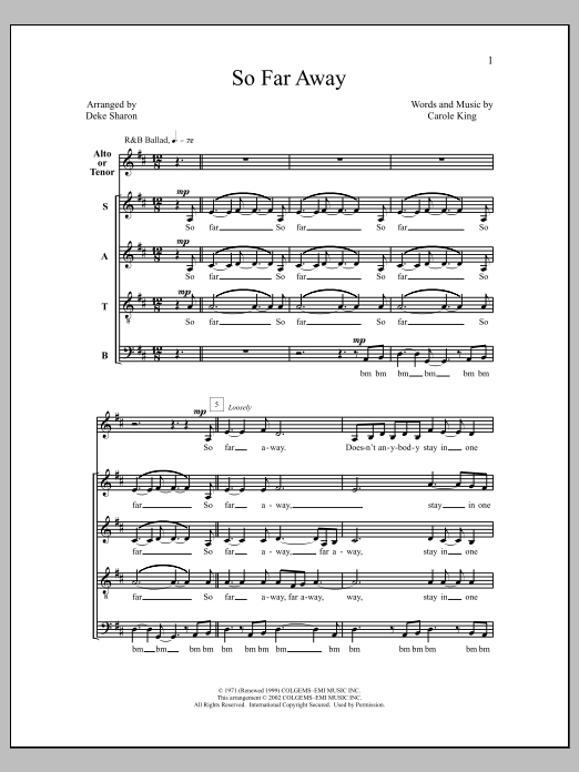 Download or print Deke Sharon So Far Away sheet music, chords and digital score arranged for SATB Choir. This A Cappella score includes 13 page(s).