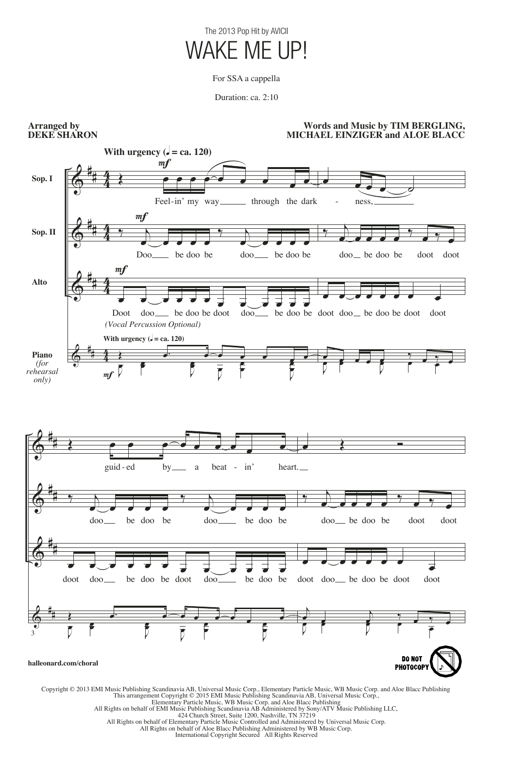 Download or print Avicii Wake Me Up! (arr. Deke Sharon) sheet music, chords and digital score arranged for SSA Choir. This A Cappella score includes 10 page(s).