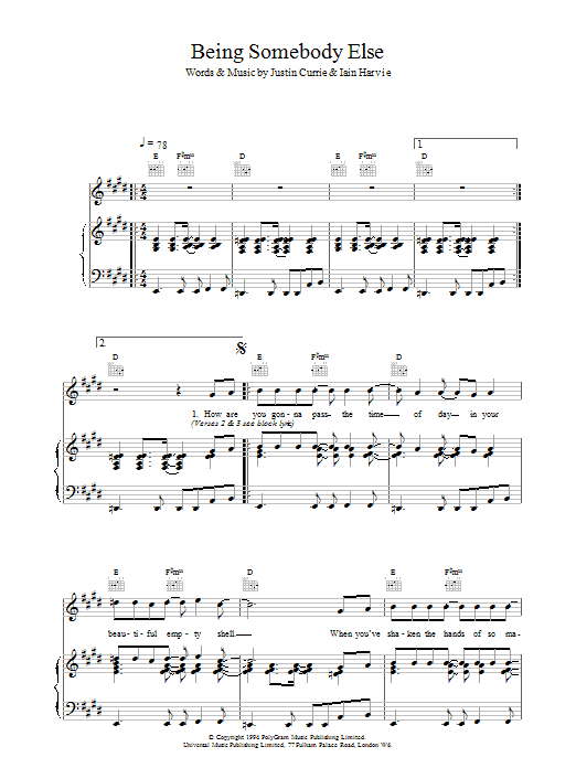 Download or print Del Amitri Being Somebody Else sheet music, chords and digital score arranged for Piano, Vocal & Guitar Chords. This Pop score includes 8 page(s).