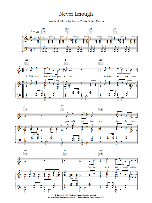 Download or print Del Amitri Never Enough sheet music, chords and digital score arranged for Piano, Vocal & Guitar Chords. This Pop score includes 6 page(s).