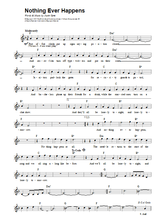 Download or print Del Amitri Nothing Ever Happens sheet music, chords and digital score arranged for Guitar Chords/Lyrics. This Rock score includes 3 page(s).