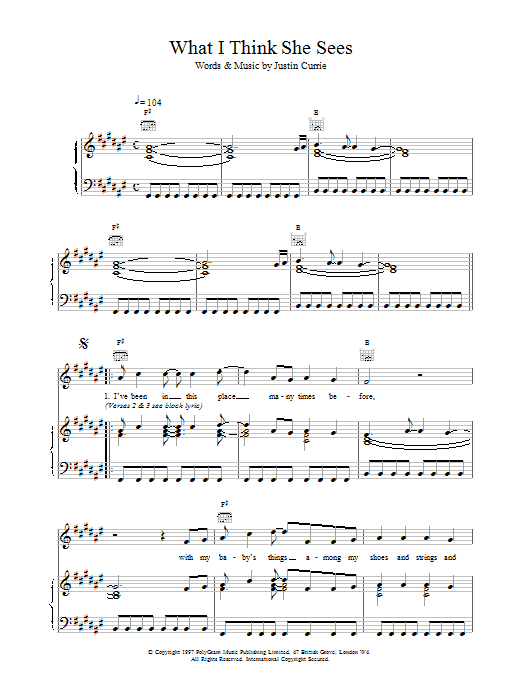 Download or print Del Amitri What I Think She Sees sheet music, chords and digital score arranged for Piano, Vocal & Guitar Chords. This Pop score includes 4 page(s).