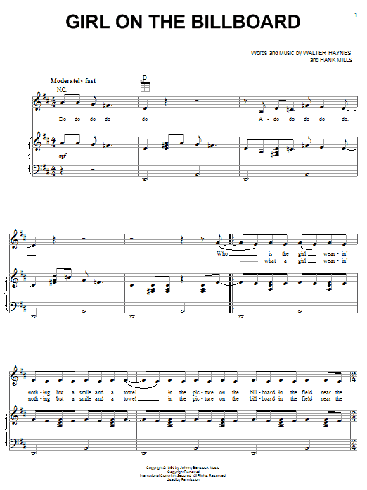 Download or print Del Reeves Girl On The Billboard sheet music, chords and digital score arranged for Piano, Vocal & Guitar Chords (Right-Hand Melody). This Country score includes 7 page(s).