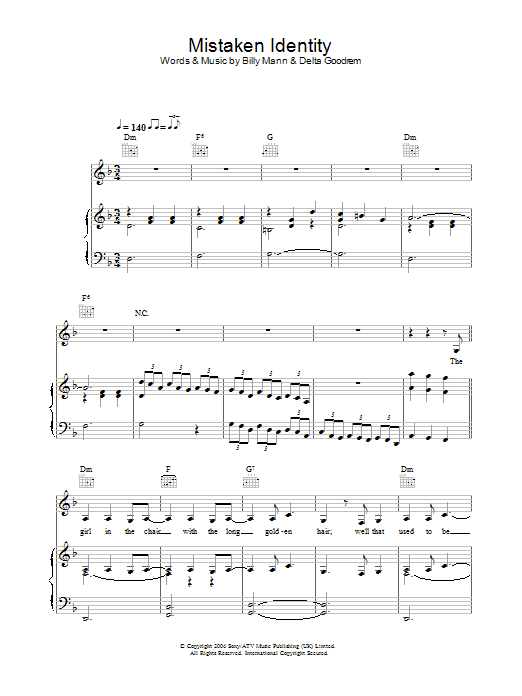 Download or print Delta Goodrem Mistaken Identity sheet music, chords and digital score arranged for Easy Piano. This Pop score includes 5 page(s).