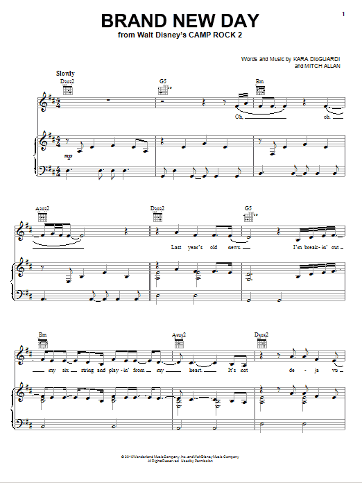 Download or print Demi Lovato Brand New Day (from Camp Rock 2) sheet music, chords and digital score arranged for Piano, Vocal & Guitar Chords (Right-Hand Melody). This Disney score includes 7 page(s).