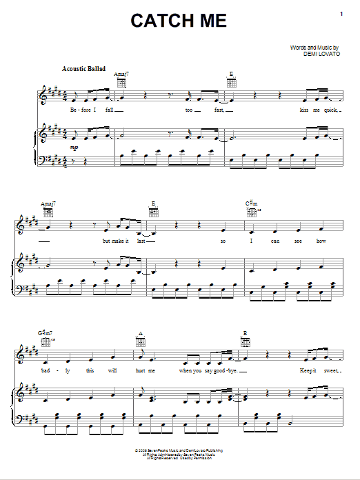 Download or print Demi Lovato Catch Me sheet music, chords and digital score arranged for Piano, Vocal & Guitar Chords (Right-Hand Melody). This Pop score includes 7 page(s).