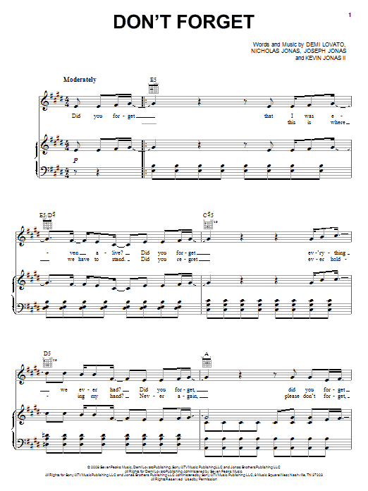 Download or print Demi Lovato Don't Forget sheet music, chords and digital score arranged for Piano, Vocal & Guitar Chords (Right-Hand Melody). This Pop score includes 6 page(s).