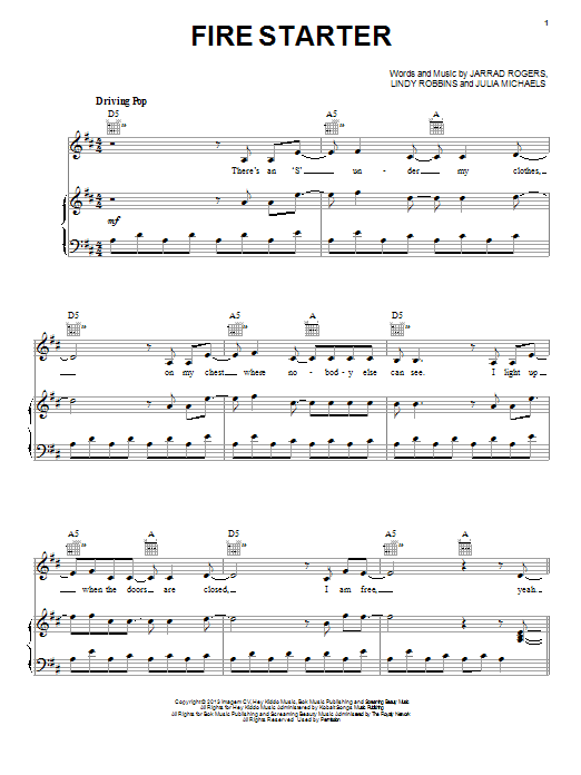 Download or print Demi Lovato Fire Starter sheet music, chords and digital score arranged for Piano, Vocal & Guitar Chords (Right-Hand Melody). This Pop score includes 6 page(s).