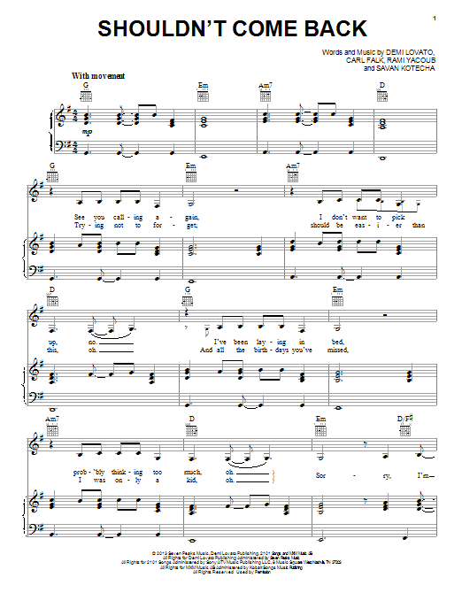 Download or print Demi Lovato Shouldn't Come Back sheet music, chords and digital score arranged for Piano, Vocal & Guitar Chords (Right-Hand Melody). This Pop score includes 4 page(s).