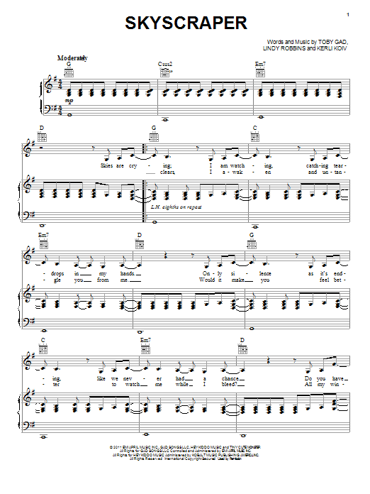 Download or print Demi Lovato Skyscraper sheet music, chords and digital score arranged for Piano, Vocal & Guitar Chords (Right-Hand Melody). This Pop score includes 6 page(s).