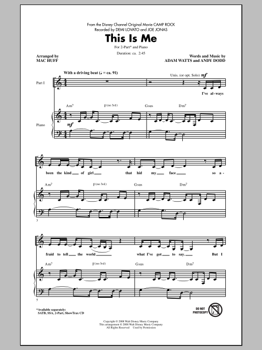 Download or print Demi Lovato & Joe Jonas This Is Me (from Camp Rock) (arr. Mac Huff) sheet music, chords and digital score arranged for SSA Choir. This Disney score includes 11 page(s).