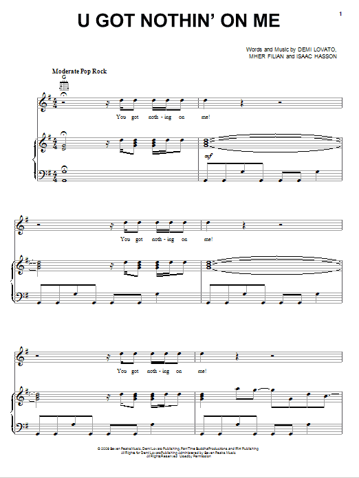 Download or print Demi Lovato U Got Nothin' On Me sheet music, chords and digital score arranged for Piano, Vocal & Guitar Chords (Right-Hand Melody). This Pop score includes 7 page(s).