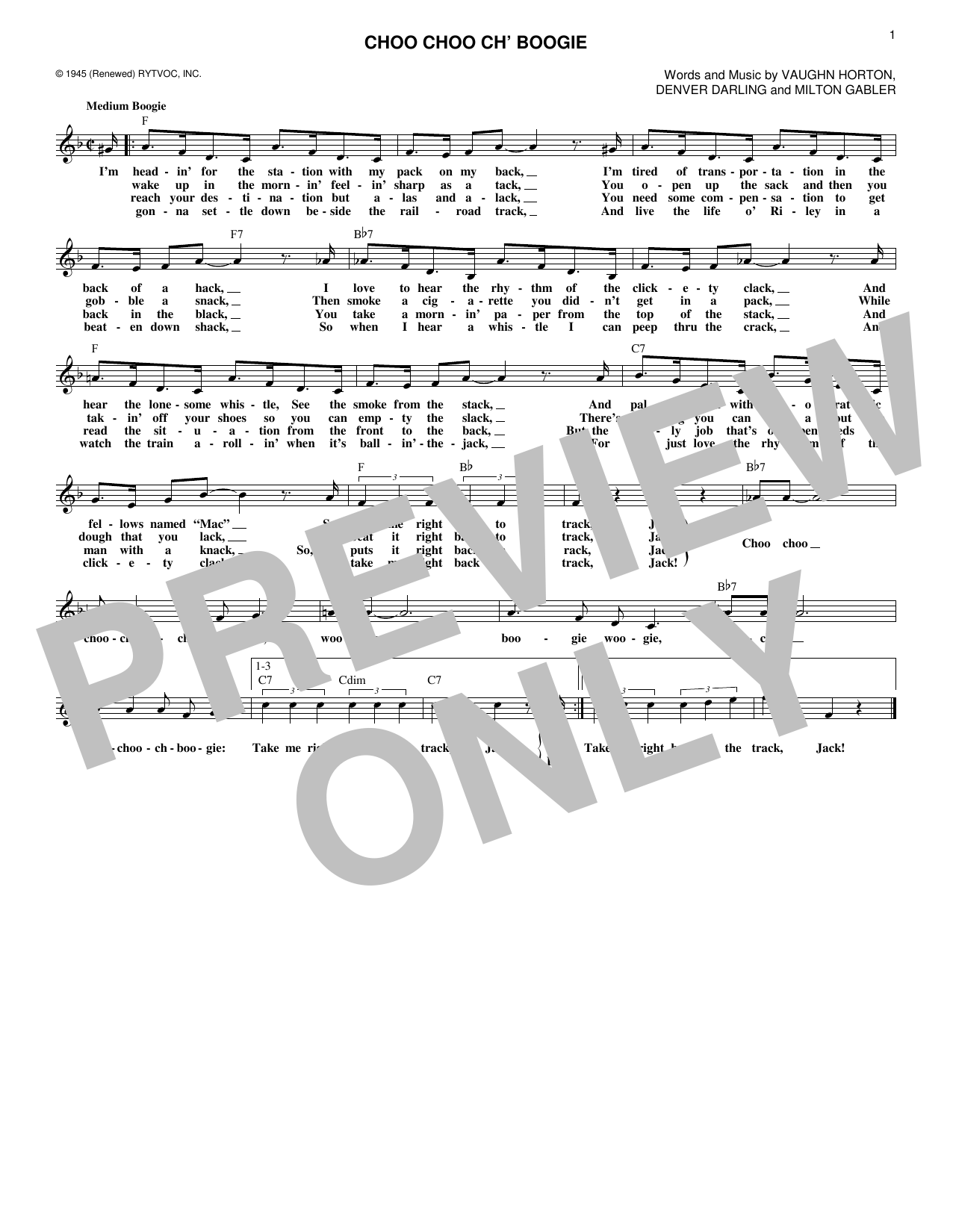 Download or print Denver Darling Choo Choo Ch' Boogie sheet music, chords and digital score arranged for Lead Sheet / Fake Book. This Standards score includes 1 page(s).