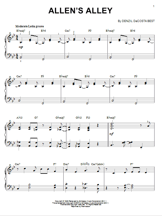 Download or print Denzil DeCosta Best Allen's Alley (arr. Brent Edstrom) sheet music, chords and digital score arranged for Piano Solo. This Jazz score includes 6 page(s).