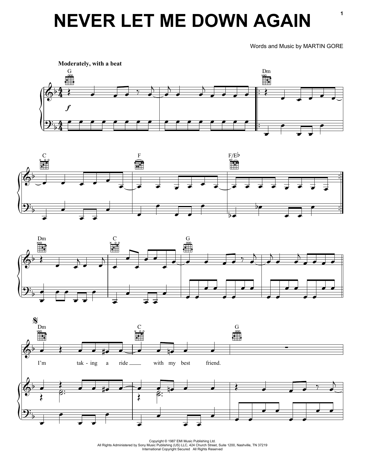 Download or print Depeche Mode Never Let Me Down Again sheet music, chords and digital score arranged for Piano, Vocal & Guitar Chords (Right-Hand Melody). This Pop score includes 5 page(s).