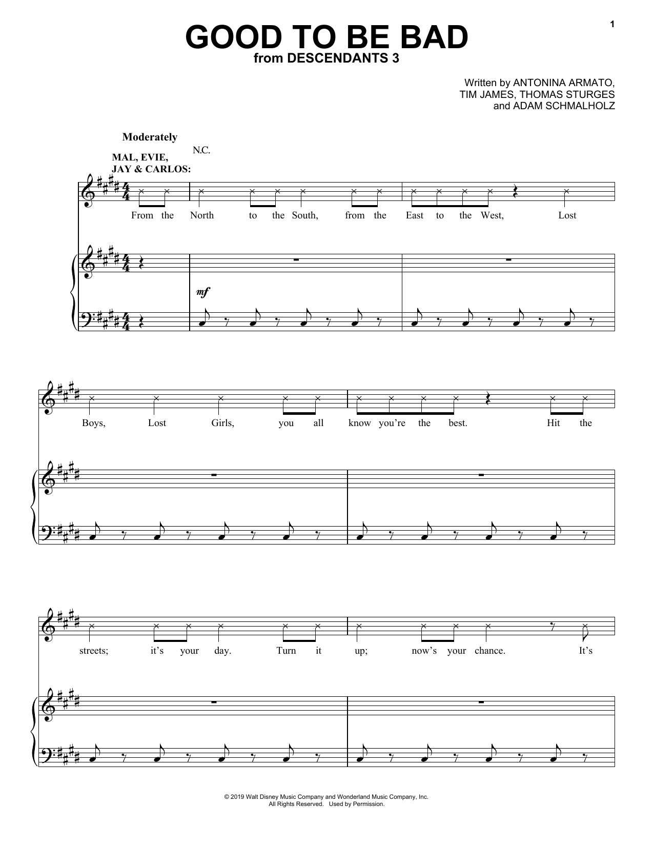 Download or print Descendants 3 Cast Good To Be Bad (from Disney's Descendants 3) sheet music, chords and digital score arranged for Piano, Vocal & Guitar Chords (Right-Hand Melody). This Disney score includes 9 page(s).