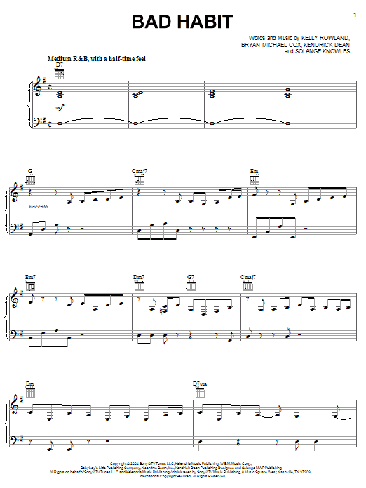 Download or print Destiny's Child Bad Habit sheet music, chords and digital score arranged for Piano, Vocal & Guitar Chords (Right-Hand Melody). This Pop score includes 7 page(s).