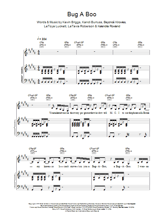 Download or print Destiny's Child Bug A Boo sheet music, chords and digital score arranged for Piano, Vocal & Guitar Chords (Right-Hand Melody). This Pop score includes 8 page(s).
