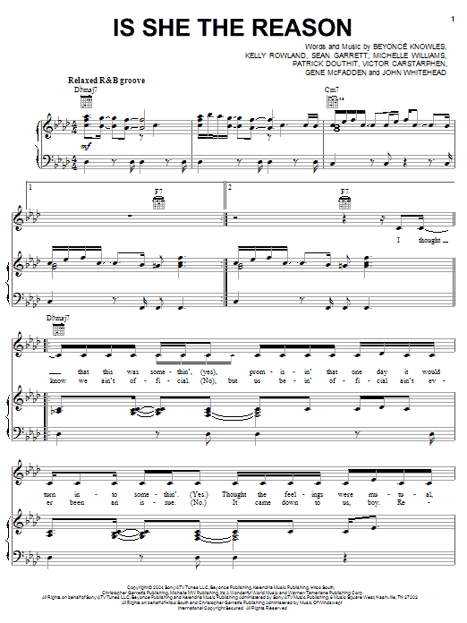Download or print Destiny's Child Is She The Reason sheet music, chords and digital score arranged for Piano, Vocal & Guitar Chords (Right-Hand Melody). This Pop score includes 10 page(s).